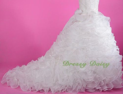 - The skirt is satin attached with at least 30 tiers of organza ruffles.